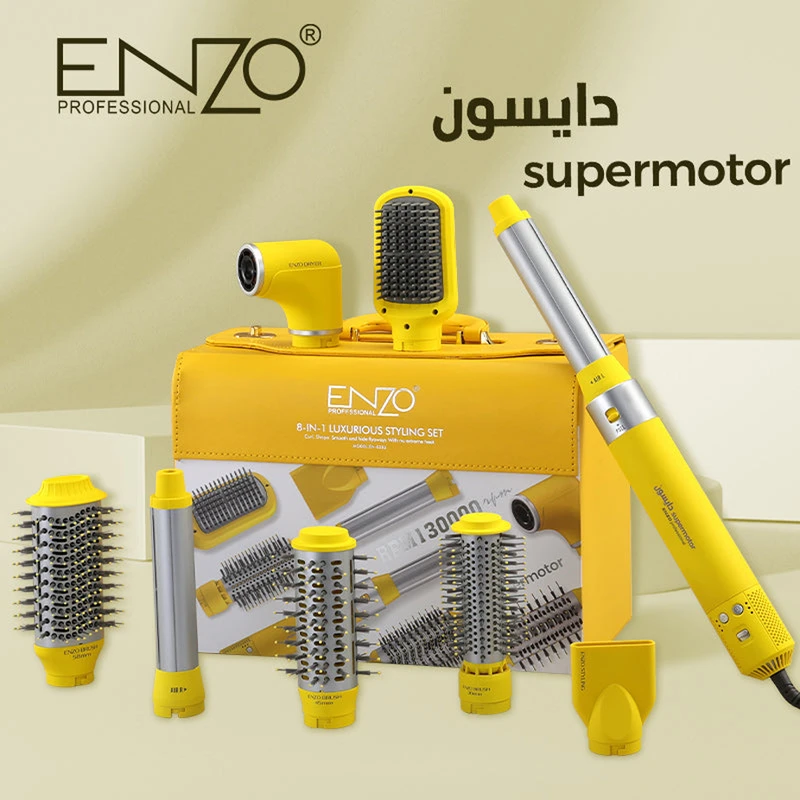 سشوار ۸ کاره انزو طرح دایسون En-6223، نه یک محصول معمولی، بلکه یک سیستم کامل مراقبت و استایلینگ مو است که مرزهای میان ابزارهای خانگی و تجهیزات حرفهای سالنهای زیبایی را درنوردیده است. این سیستم، زیباییشناسی مدرن را با اوج عملکرد فنی درهم آمیخته است و طراحی آن اصول نوآورانه و لوکس محصولات دایسون را منعکس میکند. قلب تپنده این سامانه، موتور پرقدرت BLDC (براشلس) است که با سرعت فوقالعاده و نویز پایین، جریان هوای متمرکز و پایداری را فراهم میکند.