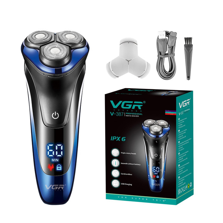 بدنه ماشین اصلاح 387 وی جی آر از جنس پلاستیک مقاوم با گواهی ضد آب IPX6 و به رنگ آبی مشکی بوده که ضمن ایجاد ظاهر لوکس و شیک برای محصول، باعث افزایش استحکام و دوام و کاهش وزن کلی آن شده است. تیغه این محصول از جنس استیل ضد زنگ بوده که در برابر رطوبت و زنگ زدگی مقاوم است. در قسمتی از بدنه دستگاه، نمایشگر LED تعبیه شده که می تواند میزان شارژ باتری و قفل مسافرتی را به کاربر نمایش دهد.