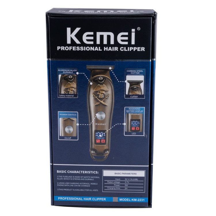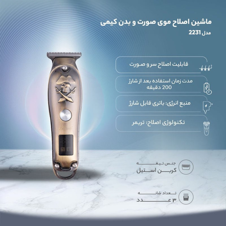 ماشین اصلاح کیمی مدل 2231 دستگاهی برای اصلاح موهای صورت و بدن، مجهز به باتری 600mAh است. این ماشین اصلاح، با طراحی ارگونومیک، قابلشارژ است و داشتن کابل یو اس بی امکان شارژ کردن آن را در هر جایی به شما میدهد. برای اصلاح مو در اندازههای مختلف،3 عدد شانهی اصلاح همراه دستگاه ارائه شده که روی تیغه قفل میشوند. این شانه ها روی تیغه های استیل کربنی ماشین نصب میشوند و میتوان طول اصلاح را با استفاده از آن تغییر داد. همچنین دستگاه دارای دکمه روشن/خاموش است. همان طور که گفته شد انرژی ریشتراش از باتری لیتیومی قابلشارژ قدرتمند آن تأمین میشود. مدتزمان شارژ کامل باتری 2 ساعت و زمان شارژدهی آن نیز 200 دقیقه است و باقی مانده باتری برروی نمایشگر LED دستگاه قابل مشاهده است. داخل جعبه برس تمیزکننده و بطری روغن نیز قرار داده شده است که برای افزایش عمر تیغهها بهتر است پس از هر بار استفاده، خردههای مو را توسط برس تمیزو تیغه ها را توسط روغن مخصوص روغن کاری کنید . به طور خلاصه اقلام همراه ماشین اصلاح موی کیمی مدل 2231 شامل: 3 عدد شانه تنظیم کننده، کابل USB و برس تمیز کننده و روغن بوده