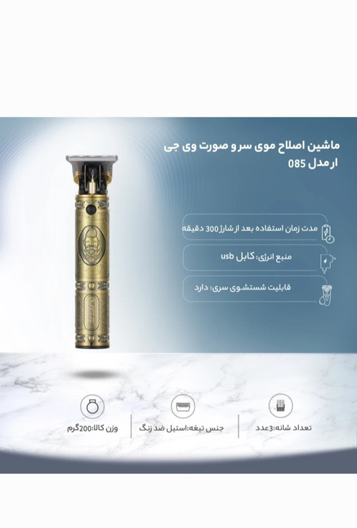 خط زن وی جی آر مدل VGR V-085 از جدیدترین محصولات موجود در بازار بوده، که برای اصلاح صورت، خط زنی، سایه زنی و اصلاح بدن میباشد. جنس تیغههای این مدل از استیل ضد زنگ بوده، که در برابر هوا و رطوبت از ماندگاری بالایی برخوردار است. این محصول از تکنولوژی برش مستقیم بهره میبرد، که موهای سر و صورت را با مرز بندی مشخص کوتاه میکند، برای اصلاح موهای بلندتر 3 عدد شانه ارائه شده است. ریش تراش وی جی آر بی سیم بوده، که در مدت زمان 120 دقیقه شارژ شده و پس از آن میتوان به مدت 150 دقیقه از ریش تراش وی جی آر 085 استفاده کرد. به همراه خط زن حرفهای «وی جی آر» مدل v-085 نیز 3 عدد شانه، درپوش، روغن، برس تمیز کننده، دفترچه راهنما و کابل USB ارائه شده است. از ویژگیهای خوبی ماشین اصلاح نیز VGR V-085 نیز باتری 1500 میلی آمپری آن و همچنین صدای بسیار کم آن هنگام کار است.