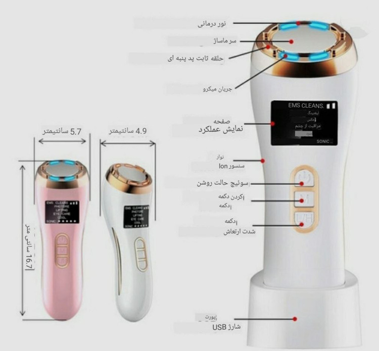 ویژگی ها دستگاه پاکسازی جوانسازی یک دستگاه زیبایی صورت با یون گالوانیک، گرمایش، لرزش میکرو و نور قرمز و نور سبز، می تواند عملکرد پاکسازی عمیق، جوانسازی بهتر و لیفت صورت را انجام دهد. 1. یون گالوانیک: با استفاده از اصل ملایم ترین ضربه. آند و کاتد می تواند چربی و رسوبات چربی که منافذ را می گیرند، پاکسازی کند، این درمان عمیق به عنوان یک پاک کننده طبیعی عمل می کند که به کاهش اندازه منافذ کمک می کند، یون های اکسیژن باردار غنی شده مواد مغذی را برای ترمیم ساختار آسیب دیده پوست و بیدار کردن سلول های خسته فعال می کند. 2. لرزش میکرو: روش ارتعاشی فیزیکی، تحریک الکتریکی و افزایش کشش و متابولیسم سلولی 3. ماساژ گرم: جذب محصولات مراقبت از پوست را تقویت می کند، بافت پوست را کشیده می کند، پوست را پر از خاصیت ارتجاعی نگه می دارد. 4. نور قرمز: نور قرمز 640 نانومتر - 650 نانومتر به عمق درم، رشد کلاژن و الاستین جدید را تحریک می کند،