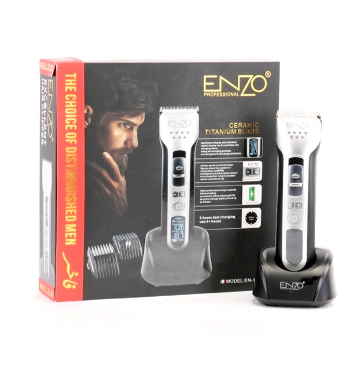 ماشین اصلاح فوق حرفه ای انزو مدل ENZO EN-1926 دارای پایه شارژر برای راحت شارژ کردن دستگاه و همچنین دارای سیم شارژ USB وکله شارژ1آمپر میباشد.