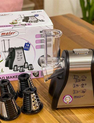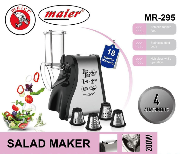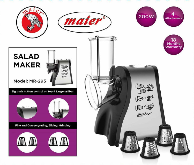 دستگاه سالاد ساز مایر مدل MR-295 دارای توان 200 وات است و نوع دستگاه 4 کاره است.سالاد ساز 4 کاره مایر مانند یک رنده برقی عمل کرده وجنس تیغه های آن استیل میباشد .دارای 4 عدد تیغه جهت خلال کردن ، چیپسی کردن میوه جات ، چیپسی کردن سبزیجات و خرد کردن حبوبات با کارکرد های متفاوت است .به راحتی قابلیت تمیز شدن دارند.جنس بدنه آن استیل ضد زنگ است.