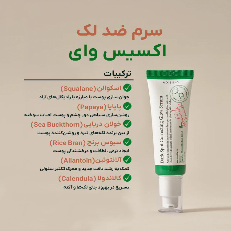 سرم روشنکننده و اصلاحکننده لکهای تیره AXIS-Y یک محصول مراقبت از پوست است که به طور خاص برای کاهش و درمان لکهای پوستی و یکدست کردن رنگ پوست طراحی شده است. این سرم با استفاده از ترکیبات روشنکننده و ضد لک مانند نیاسینامید و ویتامین C، به روشنتر شدن پوست کمک میکند و لکهای تیره ناشی از آفتاب، جای جوش و سایر عوامل را کاهش میدهد. همچنین، این سرم با داشتن آنتیاکسیدانها و ترکیبات مرطوبکننده، از پوست در برابر آسیبهای محیطی محافظت کرده و به حفظ رطوبت و درخشندگی طبیعی پوست کمک میکند.