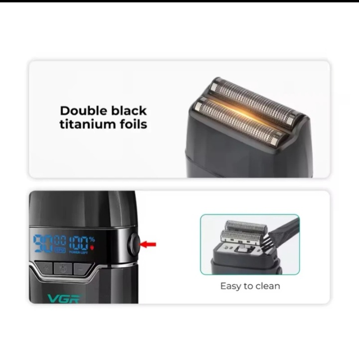 ویژگی توضیحات نوع محصول شیور (ماشین اصلاح صورت)برندVGR (وی جی آر)مدلV-308نوع تیغه فویلی (فویلی دوبل)جنس تیغه استیل ضد زنگ منبع تغذیه باتری قابل شارژ + کابل USBمدت زمان شارژحدود ۲ ساعت مدت زمان استفادهحدود ۶۰ دقیقهقابلیت استفاده خشک و مرطوب داردطراحی ارگونومیک داردنمایشگر LEDدارد (برای نمایش وضعیت شارژ و عملکرد)لوازم جانبی همراه برس تمیز کننده، کابل شارژ USB، درپوش محافظ تیغه